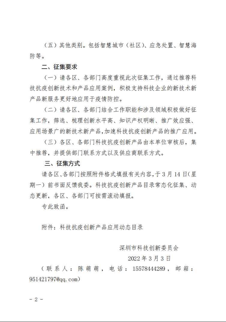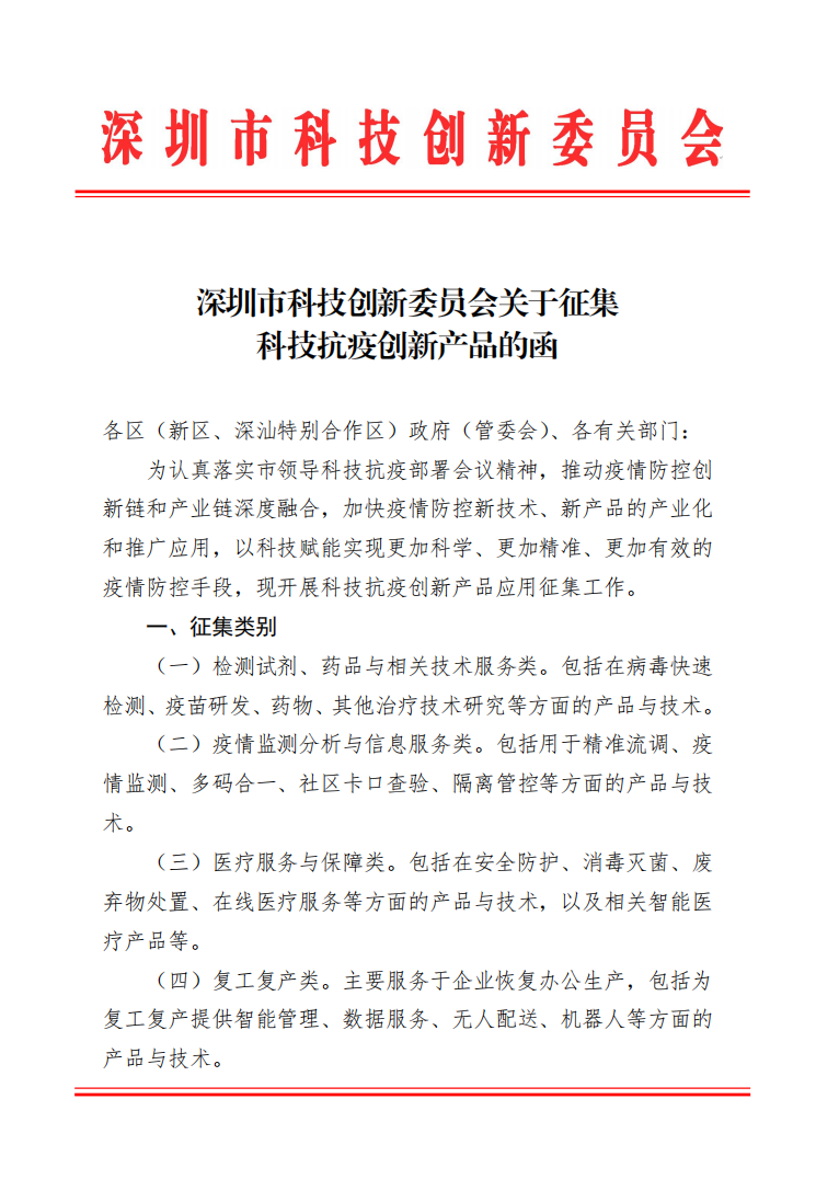 深圳市科技创新委员会关于征集科技抗疫创新产品的函