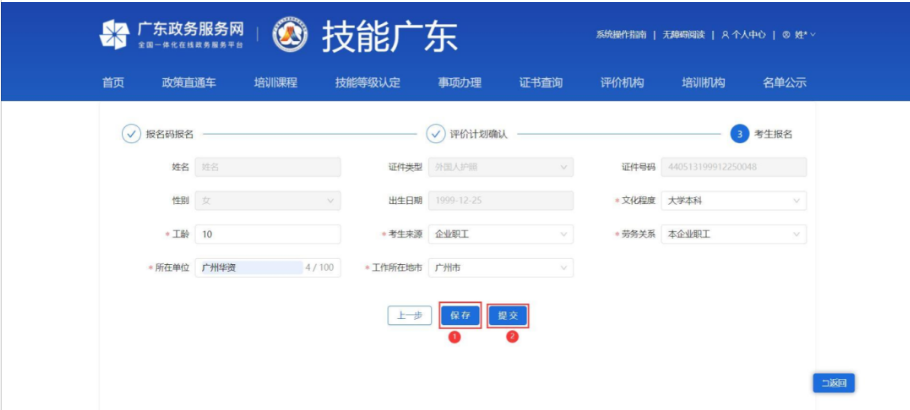 第5步:填写考生信息,点击【保存】→【提交】
