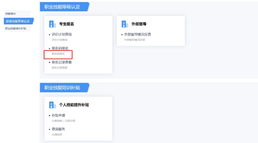 第2步:报名码报名(点击【事项办理】→【职业技能等级认定】→【报名码报名】)